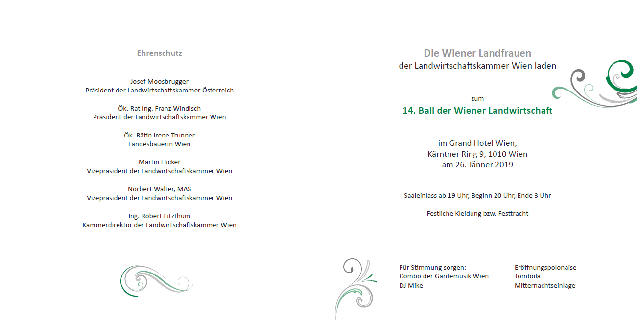 Die Wiener Landfrauen laden am Samstag, 26. Jänner 2019 bereits zum vierzehnten Mal zum Ball der Wiener Landwirtschaft. Die Veranstaltung findet in den ehrwürdigen und historischen Räumen des Grand Hotels im 1. Gemeindebezirk statt. In dieser legendären Nacht hast du die Chance mit den Berufskolleg/innen aus anderen Spaten in Kontakt zu kommen und alte Kontakte wieder aufblühen zu lassen. Für die Stimmung sorgt eine Combo der Gardemusik Wien, DJ Mike in der Disko und wie jedes Jahr eine unterhaltsame Mitternachtseinlage. Die Wiener Landjugend-Junggärtner werden als Partnerverein der Landfrauen den Ball selbstverständlich besuchen und erhalten für alle Mitglieder vergünstigte Kartenpreise in der Höhe von 25,00 €. Möchtest du dir auf keinen Fall den Event entgehen lassen? - So melde dich gleich unter Termine an! PS: Tanzbein schwingen erwünscht ;-)